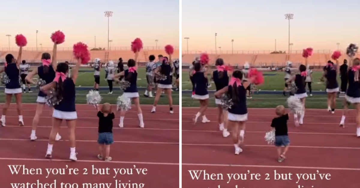 2-годишно момче ја имитира поголемата сестра која е дел од навивачкиот тим на фудбалски натпревар во Тексас.