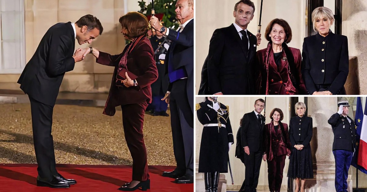 Македонската претседателка беше пречекана од францускиот претседател, кој џентлменски ѝ ја бакна раката. Пред свеченоста, заедно со нив се фотографираше и првата дама Брижит Макрон.