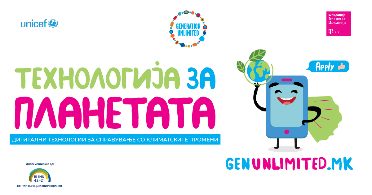 УНИЦЕФ и Фондацијата Телеком за Македонија ги повикуваат сите млади иноватори од 16 до 24 години да достават идеи за дигитални решенија за справување со климатските промени под слоганот „Технологија за планетата“.