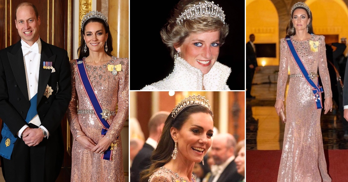 Тијарата, за која Дијана велела дека ѝ причинува главоболки поради тежината, била направена во 1914 година. Кетрин за првпат ја носеше во декември 2015 година.
