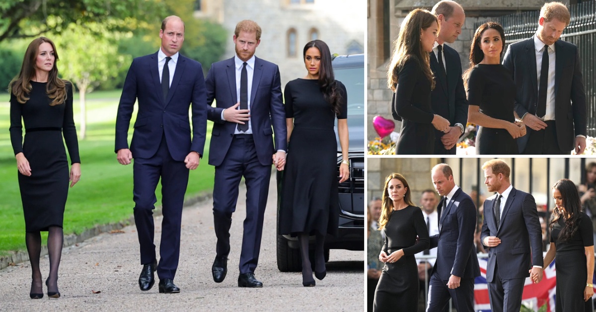 Принцезата Кетрин и Меган Маркл во црно покрај принцовите Вилијам и Хари додека ѝ оддаваа почит на Кралицата