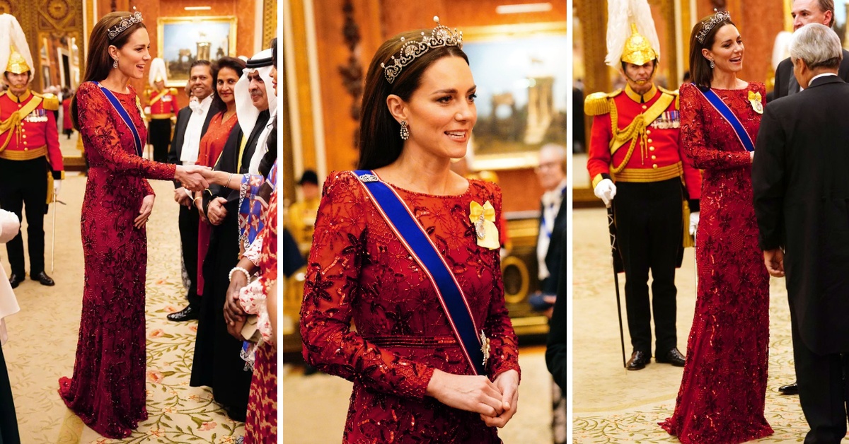Принцезата Кетрин повторно заблеска. 40-годишната припадничка на британското кралско семејство изгледаше отмено во црвена креација на дипломатски прием во Бакингемската палата.