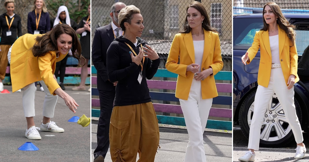 42-годишната припадничка на британското кралско семејство покажа дека може да изгледа префинето и со патики. За посетата на добротворната организација на Кели Холмс, таа носеше бели панталони и маичка, кои ги надополни со жолто сако од LK Bennett и патики од Veja.