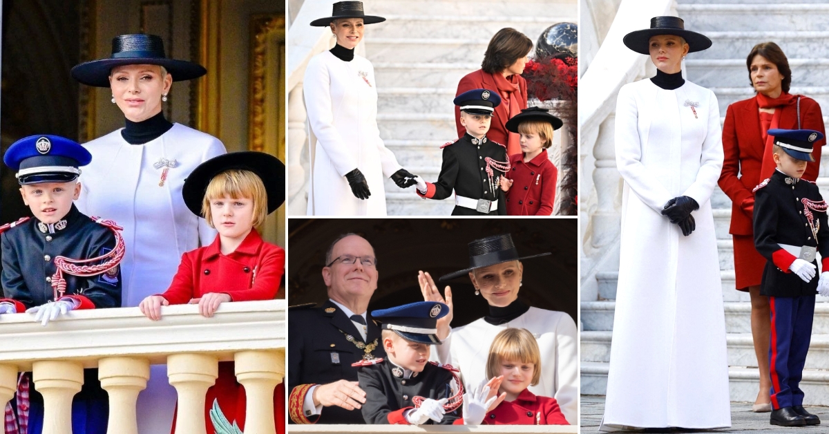 44-годишната припадничка на кралското семејство на Монако се појави на балконот на палатата заедно со принцот Алберт II и нивните близнаци Габриела и Жак. Поранешната олимписка пливачка носеше снежнобел палто-фустан од швајцарската модна куќа Akris и шешир од Стивен Џонс.