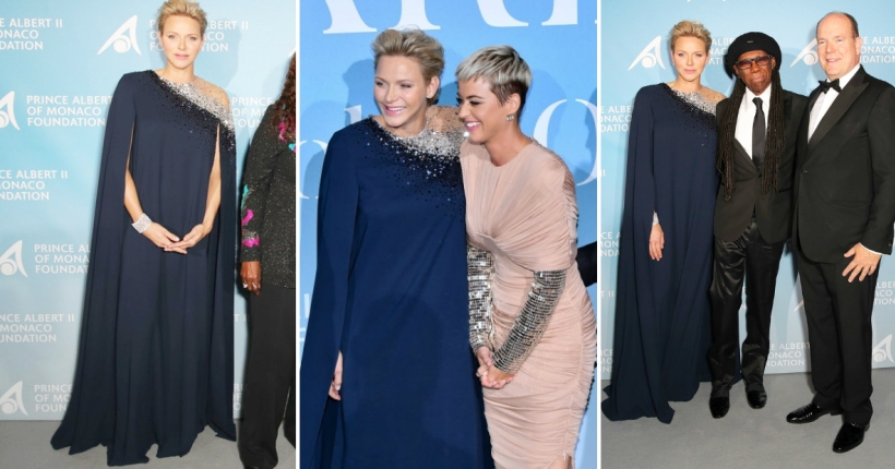 На свеченоста во Монте Карло, 40-годишната принцеза изгледаше префинето во темносина креација од Оскар де ла Рента со наметка и блескави кристали.