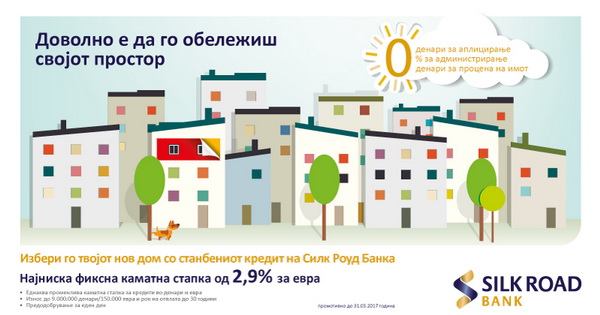 До 30 јуни може да се аплицира за станбен кредит на Силк Роуд Банка. Станува збор за кредит со најниска фиксна каматна стапка од ЕУР 2,9%/МКД 3,9% за првите 3 години и променлива каматна стапка од 5,85% за останатиот период. Во промотивниот периoд, кредитот може да се добие без надоместок за аплицирање, без трошоци за администрирање и без трошоци за проценка на имот.