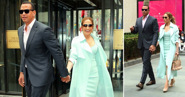 47-годишната звезда носеше ментол фустан од Ролан Муре и долг мантил во иста нијанса, кремови салонки од Casadei и чанта од Valentino додека со насмевка чекореше покрај својот сакан Алекс Родригез.