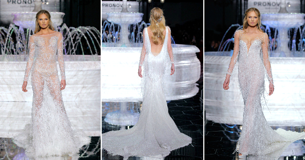 Моделите дефилираа околу фонтана додека присутните воздивнуваа на ревијата на Pronovias во Барселона.