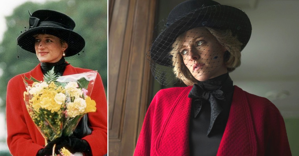 Облечена во црвено палто и црна шапка, Кристен одлично го доловува мистериозниот и тажен поглед на починатата британска принцеза.
