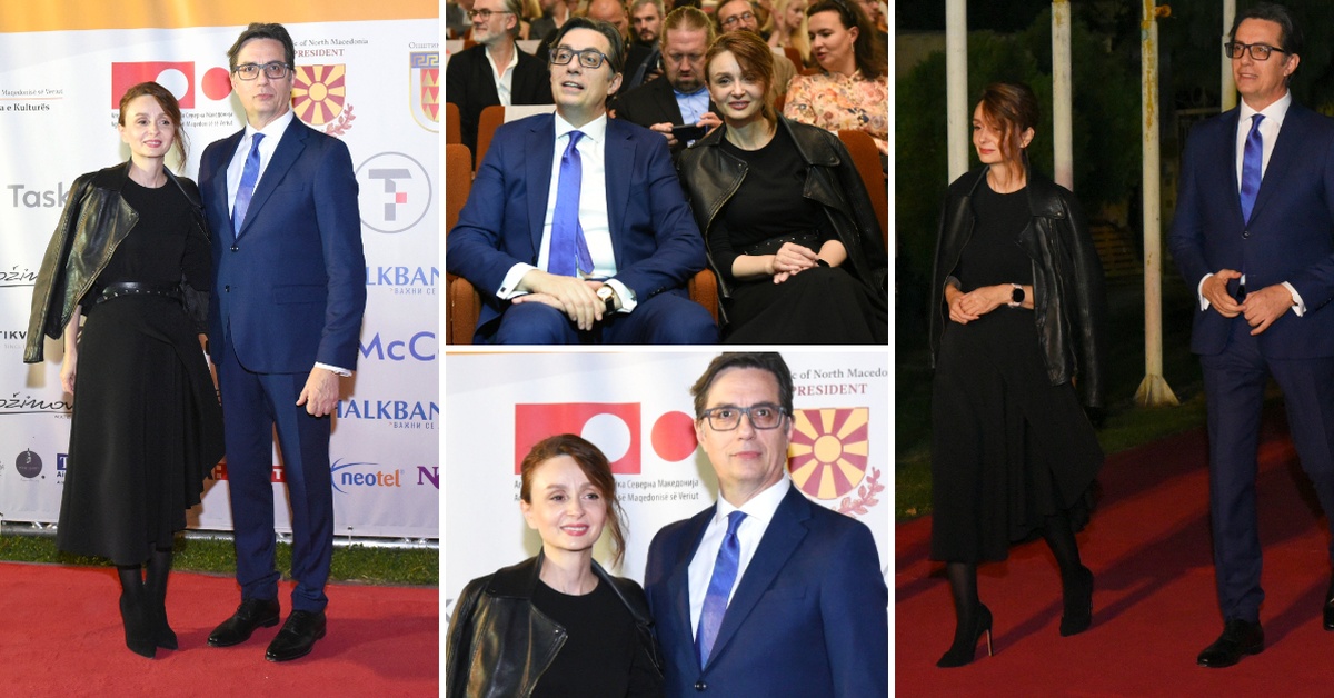 Првата дама Елизабета Ѓоргиевска во црн стајлинг со кожена јакна со претседателот Пендаровски на затворањето на „Браќа Манаки“