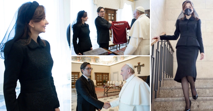 Првата дама Елизабета Ѓоргиевска во креација од Лидија Георгиева на аудиенција кај Папата Франциск со претседателот Пендаровски