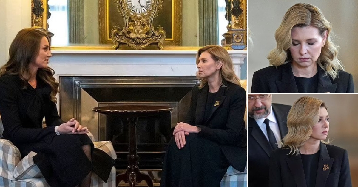 44-годишната прва дама на Украина се сретна со принцезата Кетрин во Бакингемската палата. Двете дами беа облечени во црни фустани. Сопругата на претседателот Володимир Зеленски носеше златен брош на градите.