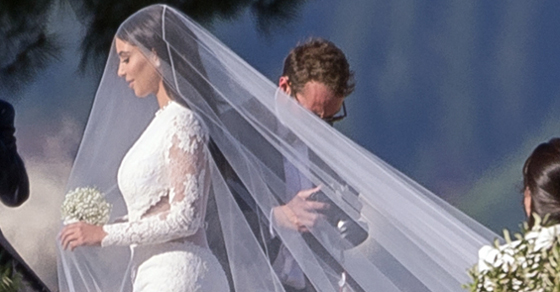 33-годишната невеста го изговори судбоносното „Да“ во фустан од Живанши, дизајниран од Рикардо Тиши, кој е многу близок пријател на младоженецот. Списанието „People“ ја објави првата свадбена фотографија на која се гледа дека Ким носи и превез.