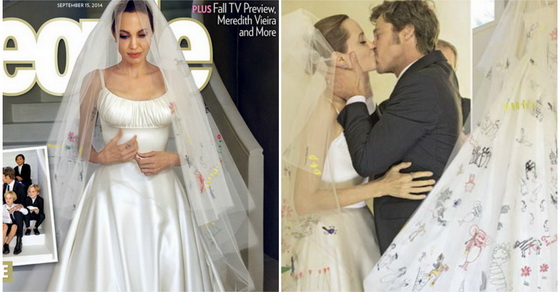 За свечениот ден Џоли избра креација од модната куќа Версаче. Нежниот фустан е уникатен и неповторлив, бидејќи ја одразува креативноста на децата на Џоли и Пит. Врз него, исто како и врз велот, биле сошиени десетици цртежи од рацете на Медокс, Пакс, Захара, Вивиен, Шајло и Нокс.