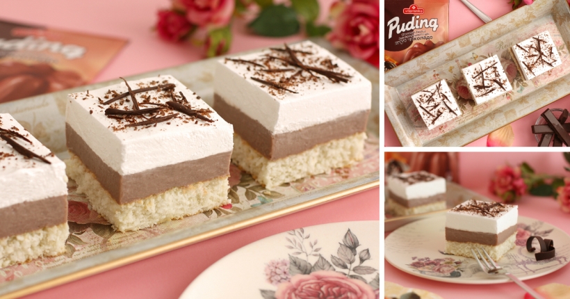 Кога сакате да се разгалите со слатка фантазија, ви препорачуваме коцки со кокосова основа со разиграна текстура, кремаст слој од чоколаден пудинг и исклучително фина прекривка од шлаг.