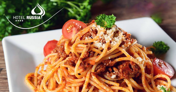„Болоњезе“ со сигурност се едно од најпопуларните јадења со шпагети. Меленото месо, доматниот сос, кромидот и морковот се дел од состојките кои ги додаваме за подготовка на ова вкусно задоволство. Ве чекаме во ресторанот во хотел Руссиа на шпагети со „болоњезе“ сос, да ги разбудиме сетилата и умот.
