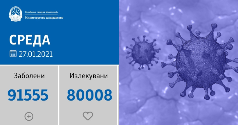 Вкупната бројка на ковид дијагностицирани во нашата земја од почетокот на епидемијата изнесува 91.555, бројката на оздравени пациенти е 80.008, на починати е 2.821, а бројот на активни случаи изнесува 8.726.