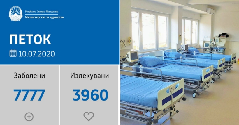 Вкупната бројка на дијагностицирани со КОВИД-19 во нашата земја од почетокот на епидемијата изнесува 7.777, бројката на оздравени пациенти е 3.960, на починати е 368, а во моментов бројот на активни случаи во земјата изнесува 3.449.