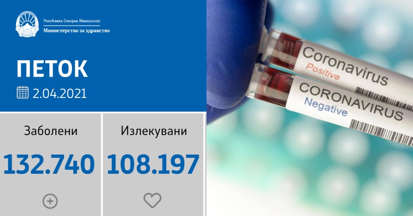 Вкупната бројка на КОВИД-дијагностицирани лица во нашата земја од почетокот на епидемијата изнесува 132.740, бројката на оздравени пациенти е 108.197, на починати е 3.860, а бројот на активни случаи изнесува 20.683.
