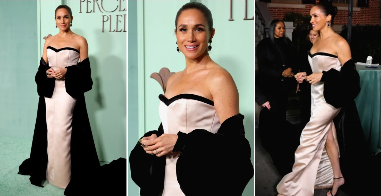 44-годишната Војвотка од Сасекс се појави во гламурозна креација со наметка на Harbison Studio, која потсетуваше на естетиката на стариот Холивуд. Фустанот, кој ја истакна нејзината фигура, Меган го комбинираше со впечатливи висечки обетки и минимална шминка.