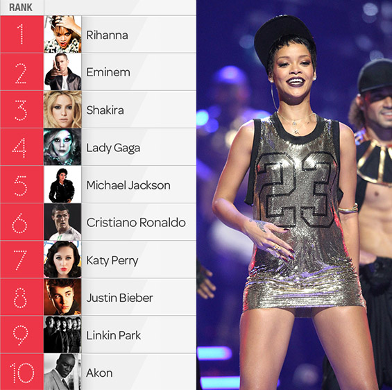 Мајкл Џексон е на петтото место со 51.980.000 фанови, Кристијано Роналдо е на шестото со 49.850.000 фанови, Кети Пери е на седмото со 47.801.000 фанови, Џастин Бибер го има осмото место со 46.795.000 фанови, Linkin Park се на деветтото место со 45.340.000 фанови, а Ејкон е на десеттото со 41.860.000 фанови.