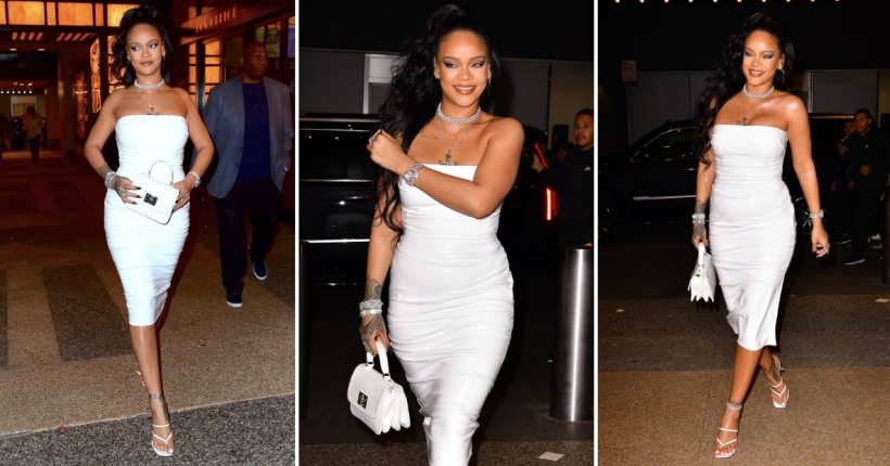 31-годишната пејачка носеше припиен бел фустан од Алекс Пери и сандали од нејзината колекција Fenty.