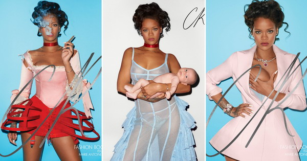 Ријана позираше пред објективот на контроверзниот фотограф Тери Ричардсон. На една од фотографиите таа носи проѕирен фустан додека во рацете држи мало бебе.
