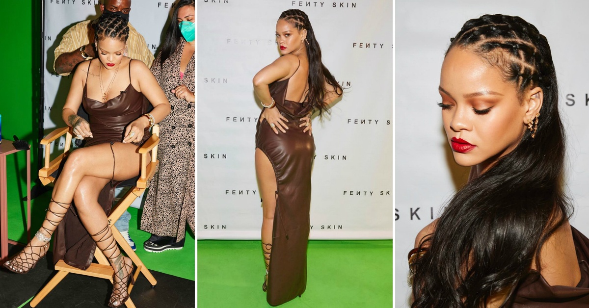 32-годишната пејачка организираше виртуелно лансирање на Fenty Skin, каде се појави во сексапилно издание. Музичката ѕвезда носеше кафеав кожен фустан со шлиц и сандали од својата колекција.