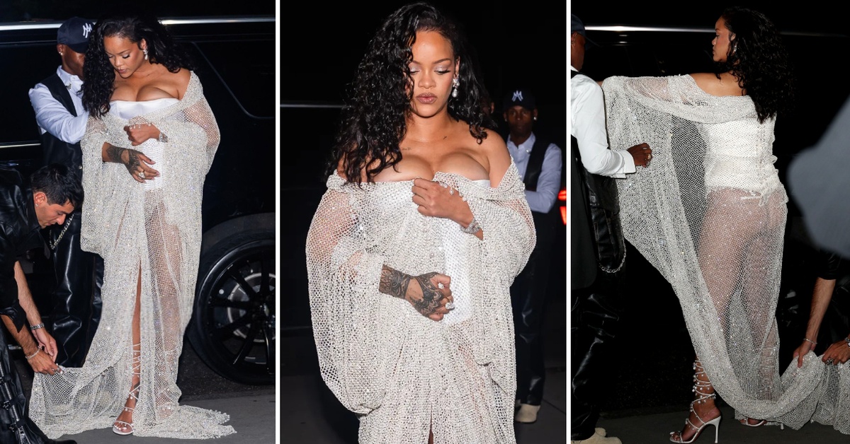 Во својот изглед, Ријана додаде блескава наметка од истиот бренд украсена со илјадници кристали.