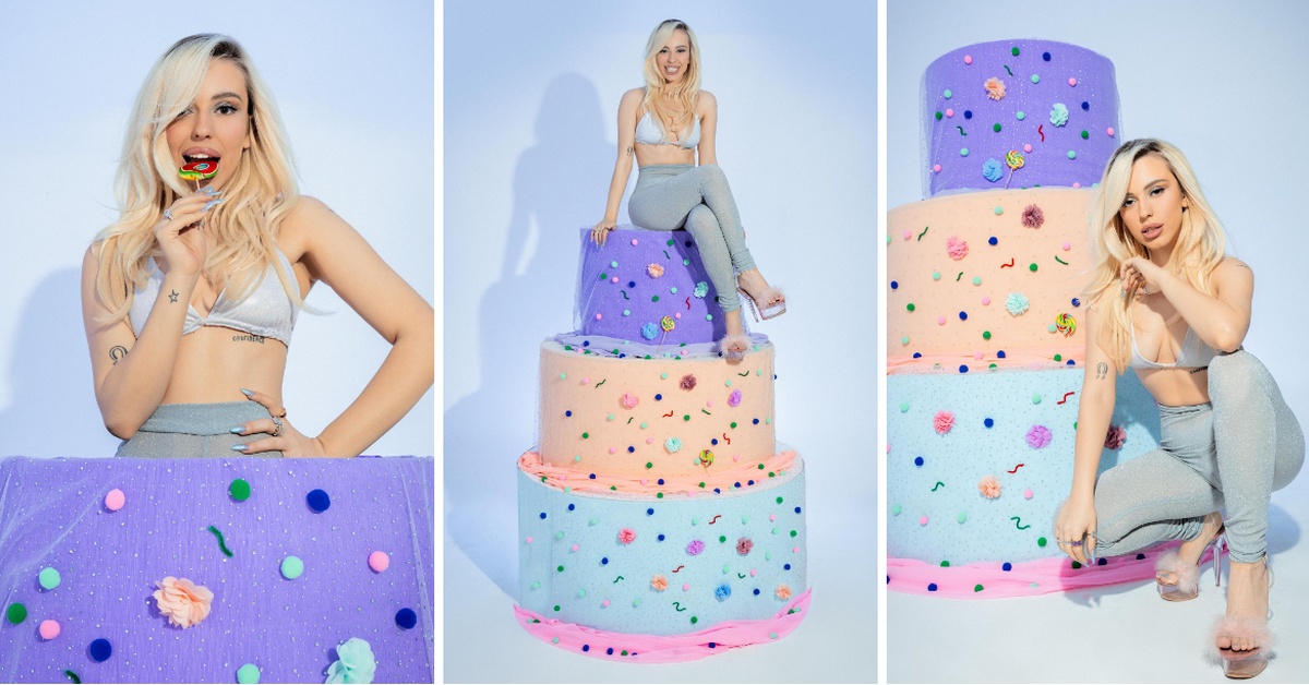 На фотографиите, младата музичарка изгледа атрактивно во сина комбинација додека позира со огромна „торта“.