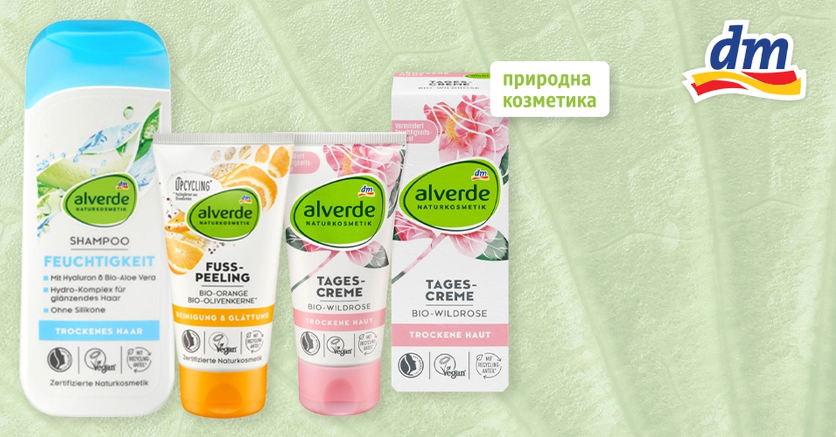 Трендот за природна козметика продолжува, а dm марката alverde е на врвот: Повеќе од 25 години оваа марка е симбол за природни производи и производство кое штеди ресурси. На почетокот специјализирана за нега на лице, оваа линија на производи во меѓувреме разви разновиден асортиман кој денес може да го пронајдете во dm дрогериите.
