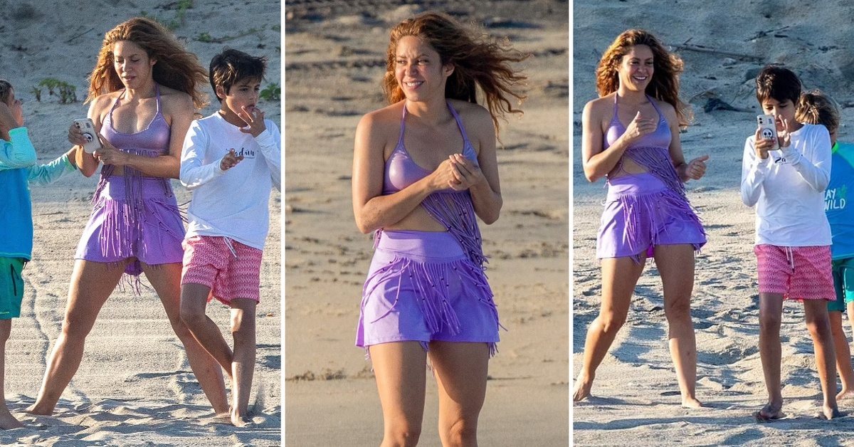 Славната Колумбијка ја покажа природната убавина во Кабо Сан Лукас. Без шминка и со опуштена брановидна фризура, таа се релаксираше во виолетов костим за капење со реси кој самата го дизајнираше.