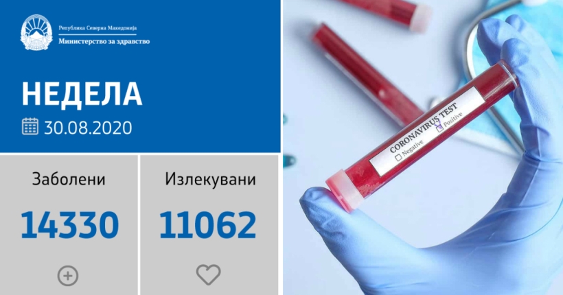 Вкупната бројка на ковид дијагностицирани во нашата земја од почетокот на епидемијата изнесува 14.330, бројката на оздравени пациенти е 11.062, на починати е 600, а во моментов бројот на активни случаи во земјата изнесува 2.668.