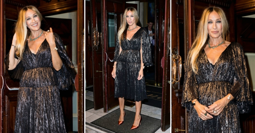 На вечерашната свеченост, 54-годишната ѕвезда од „Сексот и градот“ се појави во сјаен плисиран фустан од Џеј Мендел и елегантни салонки од нејзината колекција.