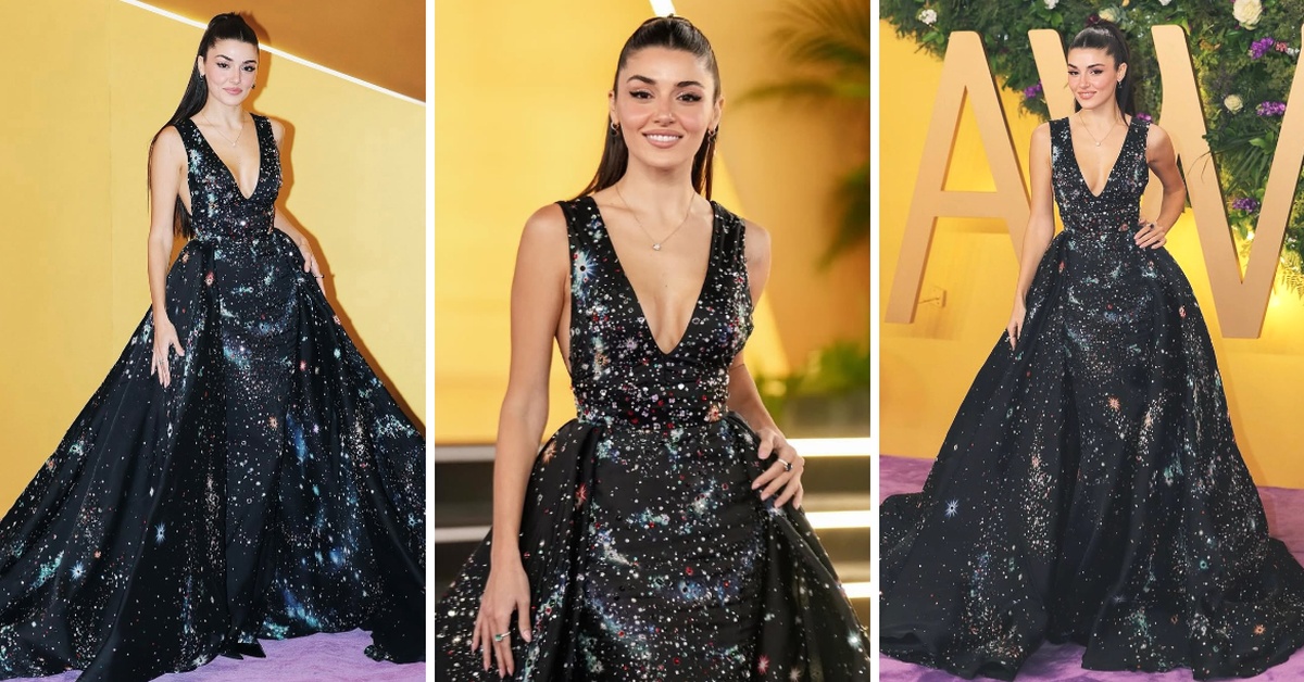 На церемонијата во Ријад, 31-годишната турска актерка пленеше во гламурозна креација од либанскиот дизајнер Зухаир Мурад, на кого му врачи награда.