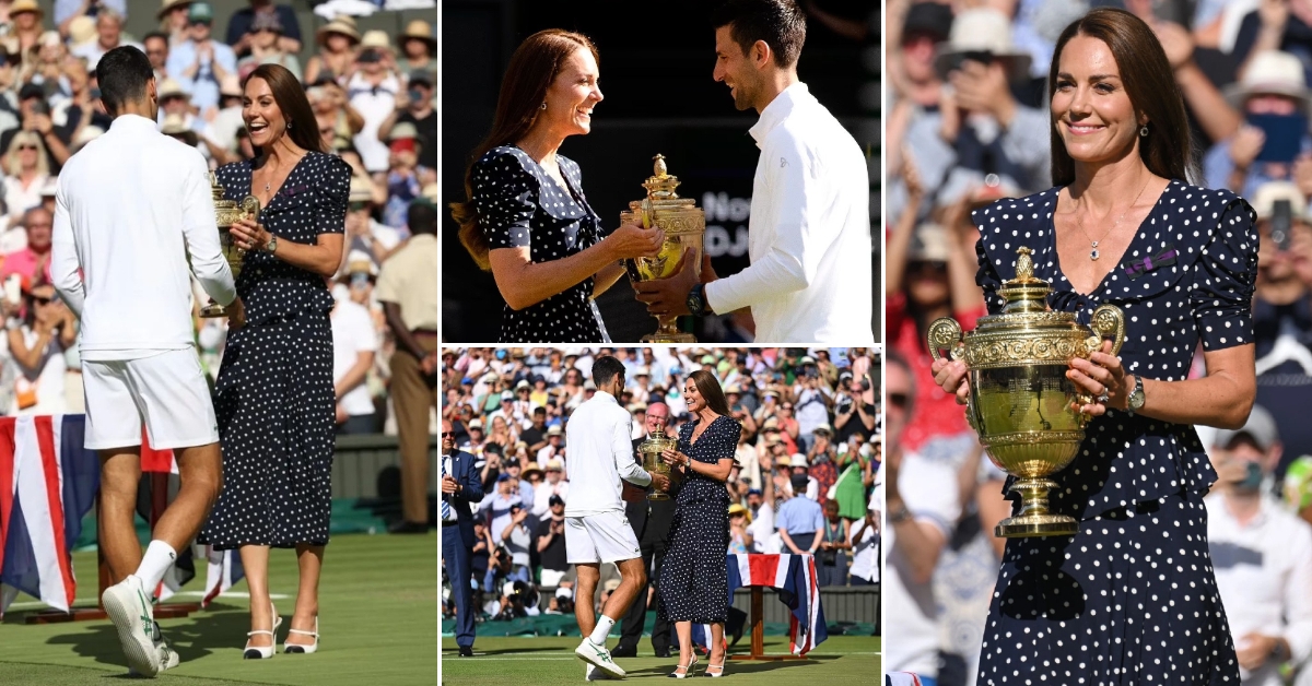 Во завршувањето на мечот, војвотката Кетрин му го врачи трофејот на успешниот српски тенисер и му ја честиташе победата. 40-годишната припадничка на британското кралско семејство, која е патрон на „All England Lawn Tennis Club“, носеше фустан со точкест принт и обувки од Алесандра Рич.