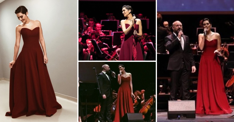 Убавата актерка изгледаше елегантно во бордо фустан од Tanju Babacan, додека настапуваше на сцената покрај својот сопруг.