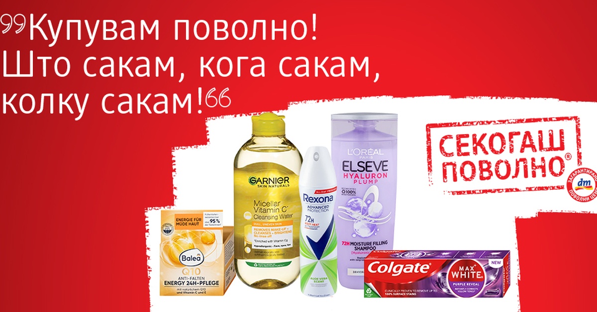 Концептот СЕКОГАШ ПОВОЛНО кој од минатата година се применува во сите dm дрогерии во нашата земја, долго време е застапен и прифатен во dm во Европа и подразбира долгорочно поволни цени, наместо краткотрајни акции и намалувања. Со ова, добивате две важни можности: заштеда на време и заштеда на пари. Се прашувате како? Ви откриваме во продолжение!
