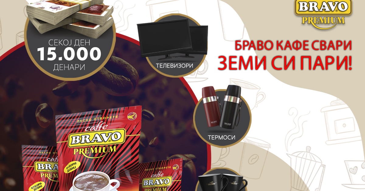 Како и досега, учеството во наградната игра е доста едноставно со купување на 100, 200 или 500 грамско пакување на Браво кафе Премиум. Доколку во внатрешноста на пакувањето пронајдете три исти вредности за награда (пример: отпечатени три телевизори) вие сте добитник на отпечатената награда. Наградната игра е веќе започната и трае до крајот на годината.