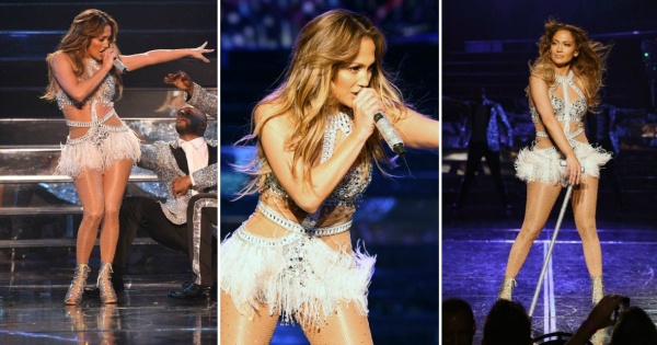 Најпрво, Џеј Ло се појавува во наметка со кристали и бели пердуви, а потоа ја соблекува и ја заведува публиката во секси костим.