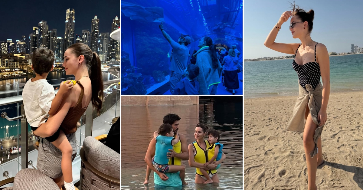 39-годишната актерка од серијата „Кога лисјата паѓаат“ и 40-годишниот актер од „Величествениот“ се забавуваа, уживаа и позираа покрај малите синчиња Керем и Каран во Дубаи.