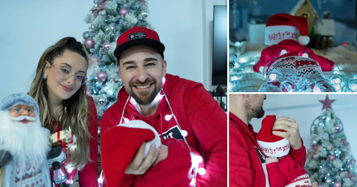 На празничните фотографии парот е во домашна атмосфера покрај накитена елка, а нивното бебенце носи слатка дедомразовска капа.