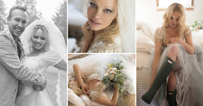 Свадбениот аутфит на Андерсон вклучуваше здолниште тип „Пепелашка“ од Џоана Дилејни, корсет и превез од модната куќа Валентино. Памела зачекори во шестиот брак во гумени чизми од брендот Hunter.