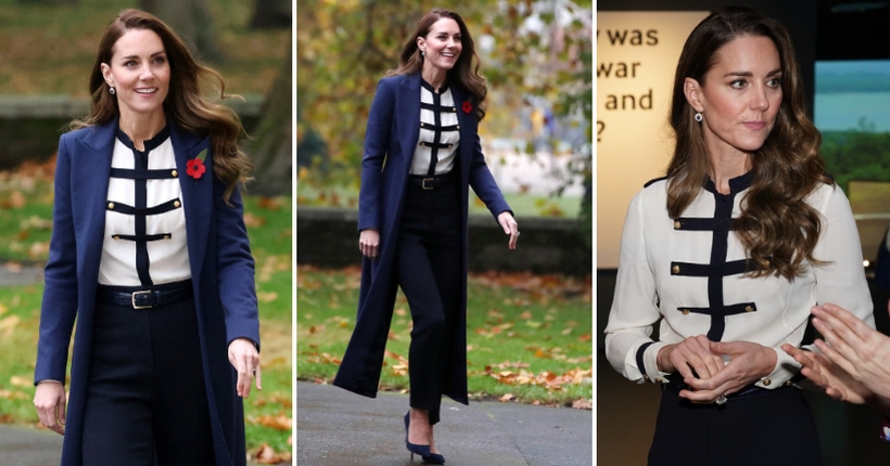 Што се однесува до модниот избор, Кетрин се насочи кон шик комбинација со милитаристички шмек. Блузата со копчиња и детали кои асоцираат на униформа е од Александар МекКвин додека палтото го потпишува Кетрин Вокер.