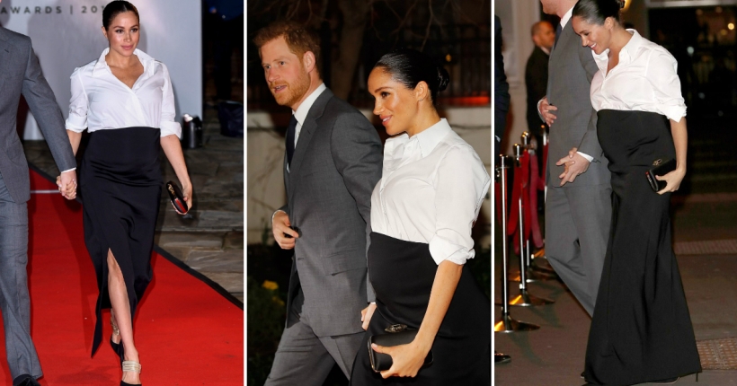 За свечениот стајлинг, војвотката од Сасекс се потпре на брендовите кои ѝ станаа омилени по стапувањето на кралска должност. Така, црно-белата комбинација и чантичката ги потпишува Живанши, а женствените обувки се дело на брендот Aquazzura.