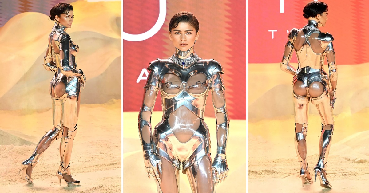 Зендаја знае како да привлече внимание. На премиерата на вториот дел на „Dune“ во Лондон, 27-годишната актерка ги привлече сите погледи кога се појави облечена во сребрен металик роботски костим.