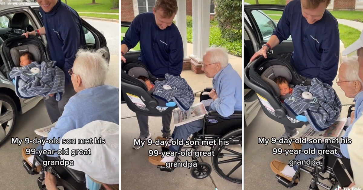 Бесценет момент на запознавање помеѓу 99-годишен старец и неговото правнуче е овековечен во видео кое топли срца.