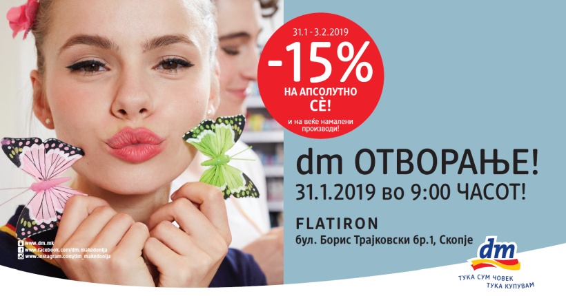 Во четврток, 31 јануари, во 9 часот наутро ќе се отворат вратите на новата dm дрогеријата во Скопје, во FLATIRON, на бул. Борис Трајковски бр. 1.