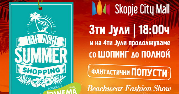 Ги повикуваме оние кои се спремаат за летото, на 3 и 4 јули да дојдат во Скопје Сити Мол да уживаат во програмата до полноќ и попустите кои ги нудат брендовите во најголемиот шопинг центар во Македонија.