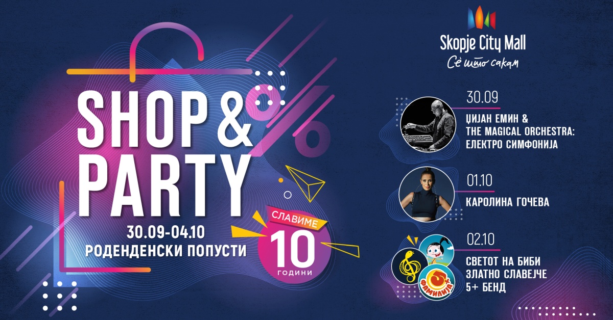 Со голема роденденска прослава и огромни попусти како што и доликува на најомилениот трговски центар во главниот град, Скопје Сити Мол го одбележува десетгодишниот јубилеј. Со концерти и забава прилагодена на различни вкусови и возрасни групи, Скопје Сити Мол ќе ги прослави првите 10 години од своето постоење. Од огнено шоу, огромни маскоти, фотобут за супер фотки, детска програма до големи концерти овој викенд сите сме во Скопје Сити Мол.